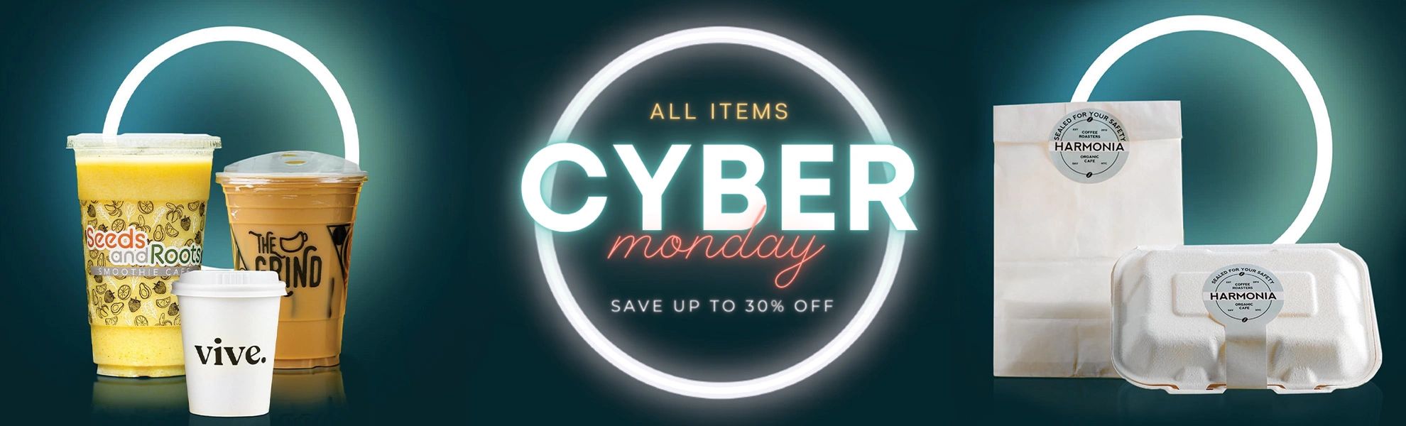Below are Cyber Monday campaigns for Your Brand Cafe including website hero images, social media graphics, and email marketing.
